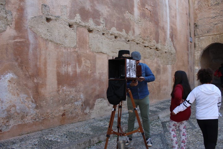 Una nena de pelo negro lacio y largo, vestida con camiseta rojo oscuro de mangas largas y calzas blancas con flores rosas, se acerca a mirar una máquina antigua apoyada en un alto trípode de madera que pertenece a un señor (que parece dedicarse a sacar fotos en la calle). Además de estar la cámara a la altura de la cabeza del señor, quien lleva una boina gris y viste una camisa de jean de mangas largas y pantalón gris, sobre la misma se posa un sombrero de copa media. Otra nena de pelo enrulado y atado, que tiene puesto un buzo blanco con algunas rayas y dibujos negros en sus mangas y un pantalón negro, no quiere saber nada y busca con su brazo tomarle la mano a la nena de rojo para irse a hacer otra cosa. Ésta última está mirando fijo a la cámara fotográfica -la cual parece salida de otra época- y le contesta sin hablar formando un rulo con su mano y esquivando el brazo de su amiga, quien ya decidida va en camino a otra dirección para alejarse de la escena. Frente a esas paredes coloniales granadinas estaba intentando sacarle una foto a lo que ahí estaba aconteciendo.